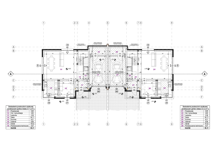 Parter (pow. 86,31 m2) o otwartej przestrzeni dziennej wraz z aneksem kuchennym, miejscem do przechowywania oraz dodatkowym pokojem. Domy łączą się garażami co gwarantuje maksymalny komfort użytkowania oraz ciszę.